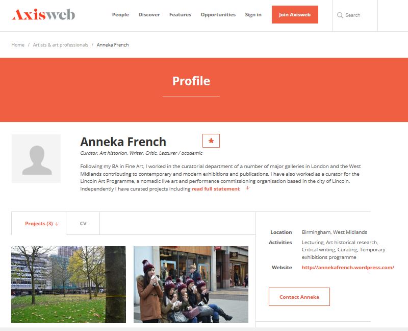 I’ve started to add some of my curatorial projects to my profile page and there’s lots more to follow. Looking forward to being able to make new connections and to discover some great artists by being part of Axis.