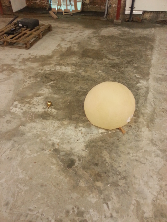 The fleshy rubber of Marder’s paddling pool is echoed in an adjacent work by Frederick Hubble called Doldrums. In this, a weather balloon was inflated just enough to allow it to bob about the space while tethered to a clock pendulum. When I saw the sculpture, some of the helium had escaped and the balloon lay in a more melancholic position, half-collapsed on the floor and patched with white tape. What began as a buoyant and mobile idea is neatly transformed into something more complex, stronger and more real. Hubble also shows a series of photographs made in the Dolomites which seem to show a snow covered mountain melting into one small drain. There is something poetic and tragic in these images, and on the day I visited, heavy rain had left small rivulets of water across the floor of The Arches Project in a serendipitous echoing of work and space.