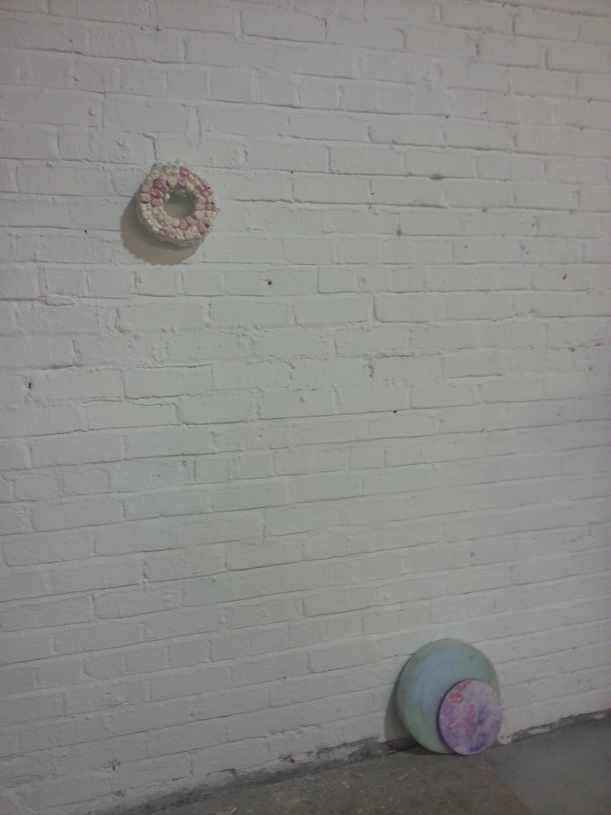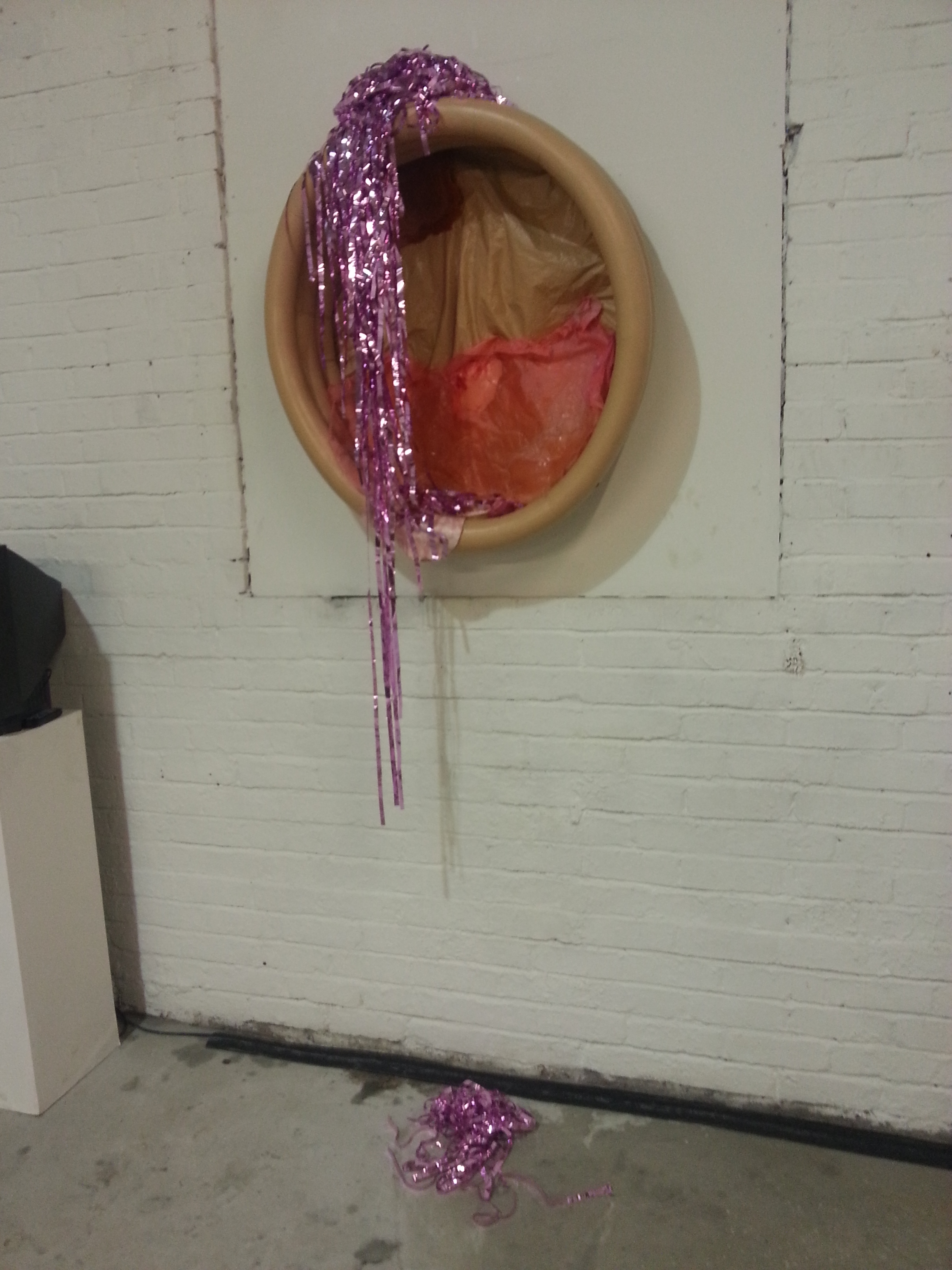 Some of the most intriguing pieces on display, however, are a series of sculptural works by Jack Marder which draw on the more sexual and sensual references implied by the exhibition’s title. Making use of the theatricality of a concrete stage-like structure, several works from his Monosodium Glutamate (MSG) series are shown on floor and wall. In one, thick smears of pastel coloured paint cover a glossy plastic disk and a spoon protrudes from a chewed up lump of expanding foam. Another is a plate sized ring of pink and white marshmallows. His flamboyant use of colour, material and subject stands in stark contrast to the industrial aesthetics of the gallery space and his most striking piece is a wall-mounted rubber paddling pool, wrinkled and painted a fleshy tone to resemble huge female genitalia. Inside, are melted sweets, layers of crusted red latex and other objects that combine the bodily with the edible. Spilling from the top of the sculpture onto the floor is a stream of sparkling pink metallic strands, of the kind used in cheerleading pompoms: a charmingly effervescent explosion of excitement.