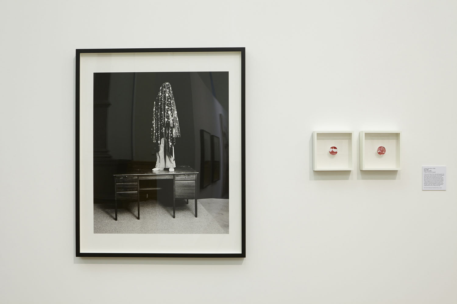 Lindsay Seers’ works Kiss (2005) and Dee’s Tree (2005) take a more alchemical view of photography and consider what might happen if the artist’s mouth was, in fact, a camera. These two small circular red and white photographs offer the viewer images of the outside world taken from the perspective of Seers’ mouth. In these, it is the body that becomes author rather than the hand or the eye, in a gesture that seems to reference the purported Cartesian mind/body split. The works offer new perspectives on what it might mean to see and to consume images. Nearby are presented a series of elongated red glass forms by Hermione Wiltshire that recall something of the colour and form of Seers’ works. The wall-mounted My Touch (1993) holds photographs at the base of each sculptural form. These are enlarged finger tips, physical manifestations in glass of the sense of touch.