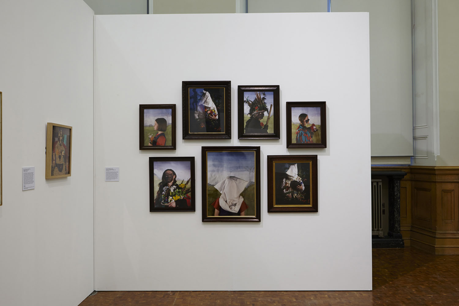 Seven striking and richly coloured portraits by Faye Claridge, for instance, explore the gaze via characters dressed in the eccentric garb of Morris dancers. Part of her series In Guise of Cultural Memory (We Come Together in Gangs) is arranged to build a larger picture from separate portraits. Two portraits of the same young girl are shown in profile. Her gaze is directed out of the photographic frame. Three others, however, have their heads covered by white hoods, while others have their faces ‘blacked up’ and direct their gaze toward the viewer in a challenging stare. As exquisitely detailed as they are troubling, these imagined portraits are sinister and theatrical, beautiful and provocative.