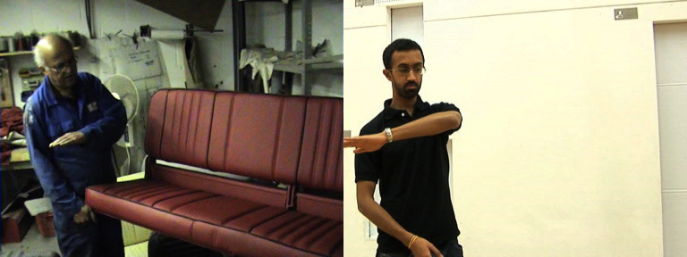 To Dance like your Dad (2009) is a two channel video installation. On the left-hand screen, Patel’s father shows the viewer around the workshop of a coach factory, and on the right, Patel mimics the actions and speech of his father from the stripped-back confines of an empty dance studio. In doing so he translates the ordinary and everyday into a choreographed performance in dislocation from its original source. These chiming voices speak with humour and a touch of melancholy, alluding not just to the linearity of family genetics, but to taking pride in one’s hard work, and the notion of following in father’s footsteps. Patel ‘performs’ his father, acting out aspects of his character as a child would do in order to make sense of themselves and their world, albeit this time in a very knowing manner.