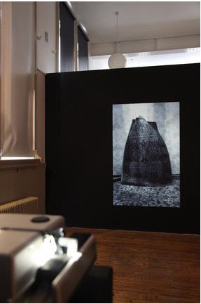 The work that shares its title with that of the exhibition, ‘Escamotage,’ meaning ‘to vanish’ is a series of five large scale slide projections. These incorporate heavily patterned ‘Oriental’ style rugs within domestic settings of ambiguous historical context. Taking some influence from the ‘hidden mother’ photographs that have been recently been popularised, the rugs are positioned to cover the body of the artist. In concealing the body, however, the strange positions of the textile confers an uncanny quality, for after all, rugs do not usually stand by themselves on end. In this way, the patterned textiles both hide and point attention toward the body behind, creating dramatic self-portraits of a sort, where nothing is quite as it seems (in fact some of the photographs contain no body at all). The lamp from the projector is slowly eating into Williams’ slides, creating a series of subtle colours in the black and white film that she cannot fully control. I got the feeling that these projected images were moving just a tiny amount, but they couldn’t be: they’re only slides …