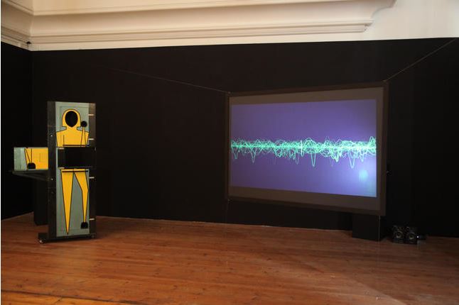 Themes of magic, illusion and mediumship run throughout ‘Escamotage.’ These are emphasised by dark walls and dramatic, theatrical lighting that shapes the space and directs the experience. If ‘Apport’ relates specifically to material objects and to scent, then other works within the exhibition refer to other senses and more ephemeral phenomena. ‘Simultaneity,’ for instance, taps into the idea of sound in connection to mediumship, as another sensory way in which the body can channel or manifest the spirit world. It features the voices of the female mediums Doris Stokes and Sylvia Brown, again exploring the performative aspects of the field of mediumship as it exists today. The work is displayed on a suspended projection screen and features waves of sound as green dancing lines that move according to the voices of Stokes and Brown. Sound clips edited by Williams create new narratives that tap into some of the controversy surrounding the theatricalisation of mediumship and its potential to exploit the grieving and the vulnerable.