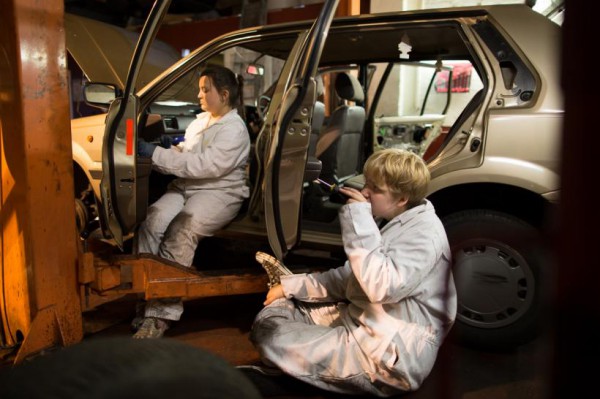 Previous showings of ‘Car Deconstructions’ have sited the work outdoors. Each ones becomes a unique relational project. There is always a new (old) car, a different set of girls to work with and a different audience, all with their own attitudes towards gender, adolescence, manual work and art. On the first day here, several of the mechanics who work at the garage are still there finishing up for the day: working on other vehicles, talking in the office, smiling wryly at the deconstruction in front of them. They decide to stay and watch, amused expressions on their faces. I ask them what they think. They seem to like it, they say it’s good but they don’t call this art. One ex-taxi driver who works there tells me that he has never seen a female mechanic in all the time he drove taxis. That was for forty years. And that is the point.