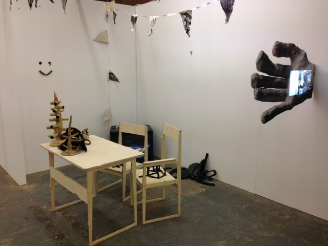 A collaboration between Grand Union in Birmingham and Worcester’s Division of Labour proved to be the most successful and engaging stand at the fair, precisely because it explored this specific context for the display of art, rather than trying to ignore it as many galleries did. ‘Booth’ by Luke McCreadie was a complex installation that drew together diverse aspects of McCreadie’s professional experiences, from weekend car-booting to installing sculptures for Phyllida Barlow. His installation included ‘Brutalist Bunting,’ in a wry parody of the revival in homemade crafts and an upsurge in the popularity of Brutalist architecture as it comes under increasing threat, particularly in Birmingham. He included casually arranged floor-based sculptures whose forms were taken from the punctuation marks of sculpture books, and a table and chairs which showed the three-dimensional outline of the artist’s thumb along several edges of the wood, as when a child draws around their own hand. Seated on these chairs were bizarre ceramic portraits of the directors of Grand Union and Division of Labour, playful nods made to their role and significance to an artist’s commercial career by bringing these portraits into the display itself.