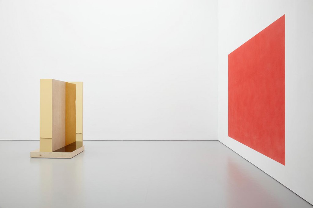 Installation view, including ‘Scenes #2’ (2015; left) and ‘Reproductions (#3, red)’ (2010/15; right) Image courtesy Stuart Whipps (photographer) and Spike Island. All works courtesy of the artist and galleries Balice Hertling, Hannah Hoffman and Francesca Pia