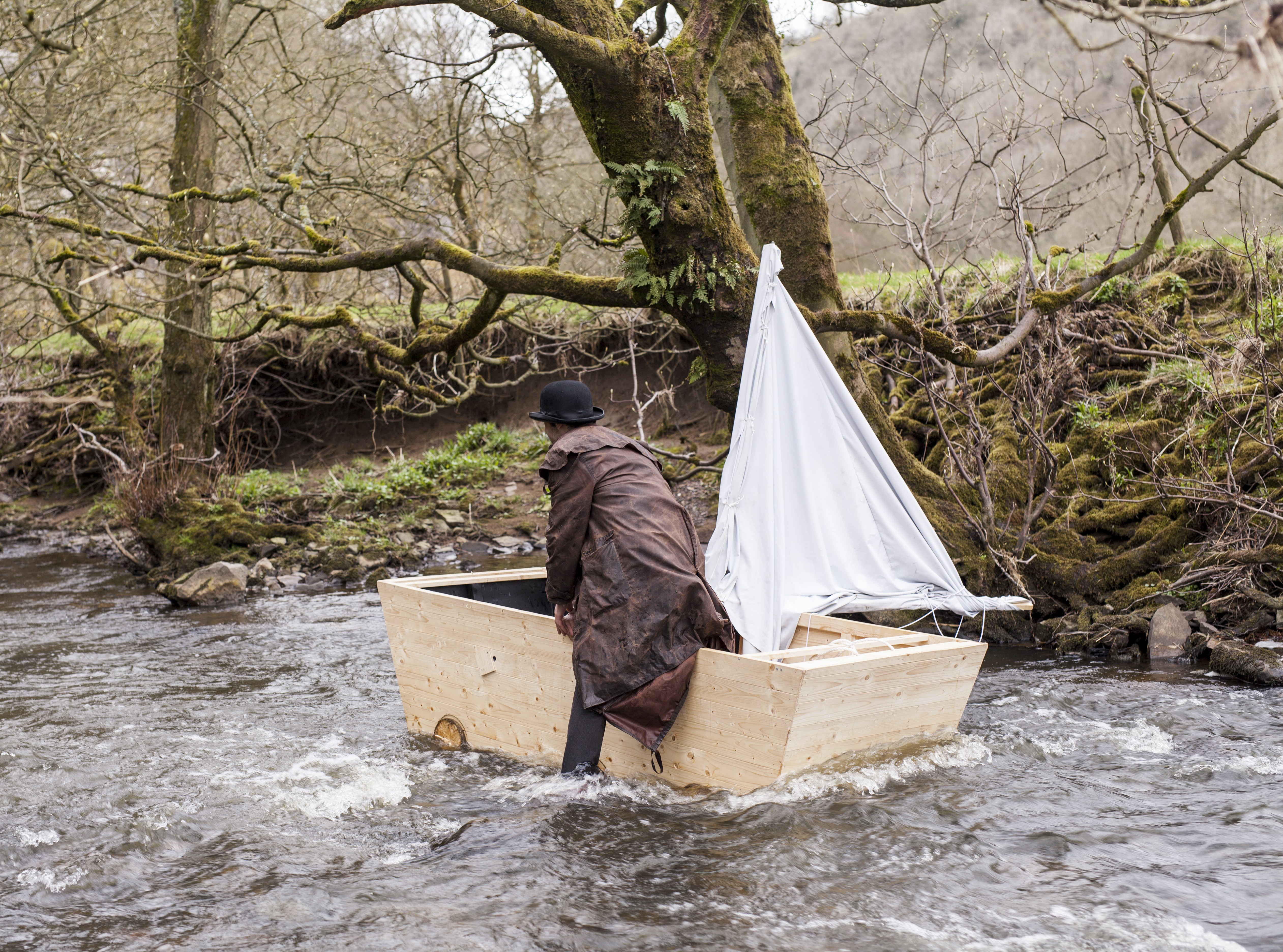 Not too many miles from here, another boat-not-boat can be found. Bumping along hilltops on the north-westernmost ridge of a limestone plateau, this boat is also a cart, a camera and a darkroom. Its hull is made of bleached pine boards, and it has wheels that help the explorer to push and pull it across the thinly-soiled grassy slopes and rocky outcrops. His back is bent double, his legs at full stretch. Up slope, down slope, heave ho. The boat’s white sail shines bright against the scrub-grass, its appearance unexpected and delightful.