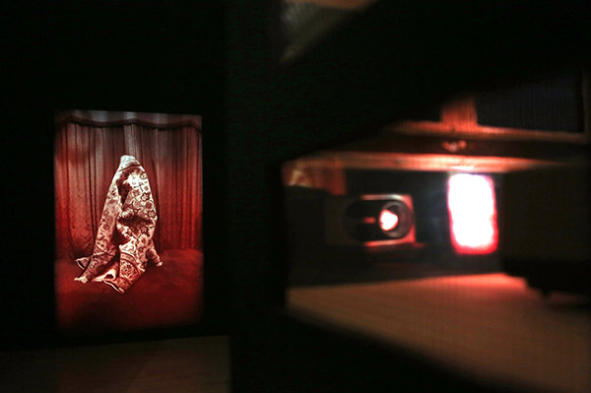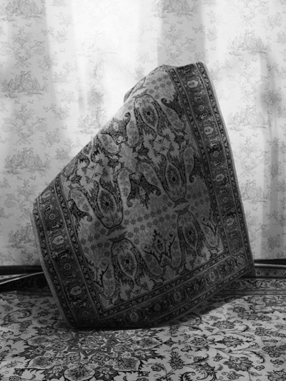 The display of the slides is also significant. Projected directly on to the wall, the photographic object is rendered image, its intangible and durational life played out in and against physical space. In its making,Escamotage has moved through numerous two and three-dimensional variations, from ‘real’ object/person, to image, to object and to projection in a process which has altered both the context and content of the work. That the entire gallery wall is painted black rather than displaying a white or grey framed space further underscores the illusory quality of the projected photograph. Without a clearly defined projection frame, the image is fuzzy along its edges, gently bleeding into the structure on which it is displayed. It gives the impression of vibrating softly against the wall and the figure beneath the rug seems to move very subtly. The ghostly effect is heightened the more time one spends with the work, as it alters beneath one’s eyes and possibilities are made manifest.