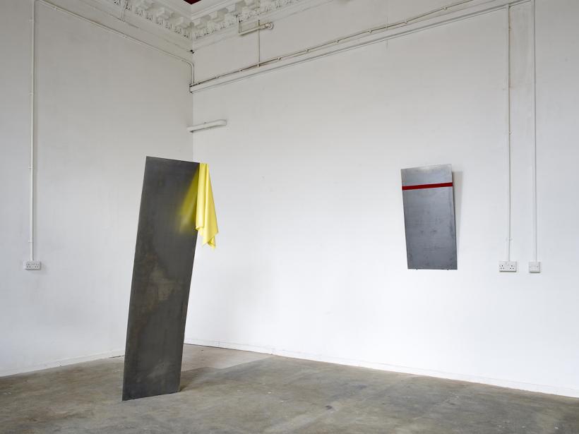 In the first and largest sculpture ‘Untitled’ (all works 2016), a tall, gently curving 3mm steel sheet is propped, buried within a shaft cut into the gallery’s concrete floor. It slices through the space, at a dangerous, precarious angle and looms, just balanced. From its furthest corner, a soft sheet of bright yellow latex hangs limp, like a draped duster.