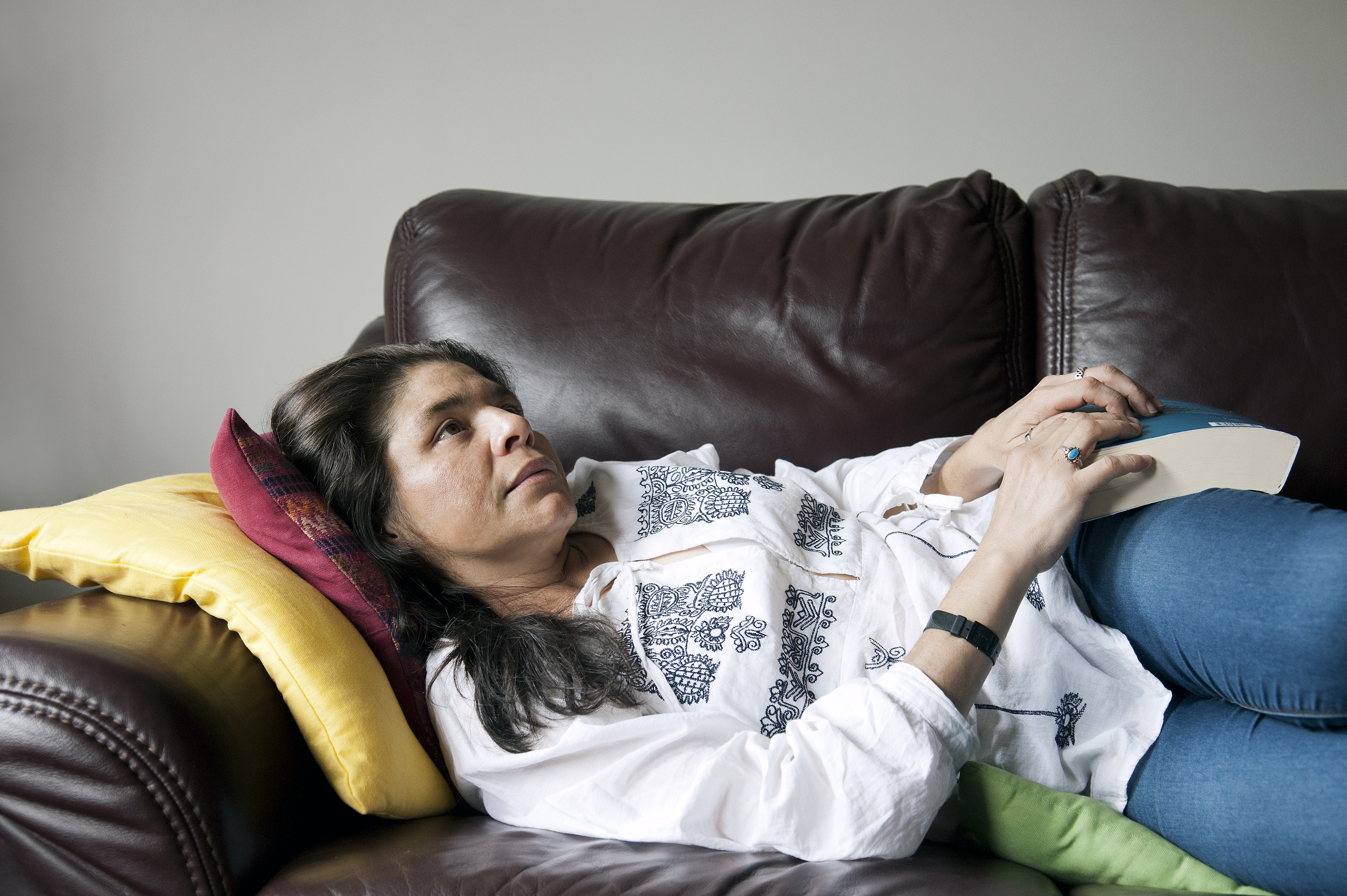 Many of the portraits themselves are set within the sitters’ bedrooms, living rooms or gardens in London. One or two of them show the sitter in an outdoor area of a social housing estate, while others are taken in artist studios or at train stations – unassuming and familiar contexts that offer a small window into their lives. Each image is accompanied by the sitter’s first name and some scant biographical information about them, helping us to locate and contextualise their narrative in relation to their education, interests, skills and employment. The description accompanying one particularly wistful looking woman lying on her sofa holding a book reads ‘Carmen from Nicaragua works in the charity and Fair Trade sectors. She holds a BA in Economics’. Exhibition visitors are left, impossibly, to complete the rest of Carmen’s narrative.