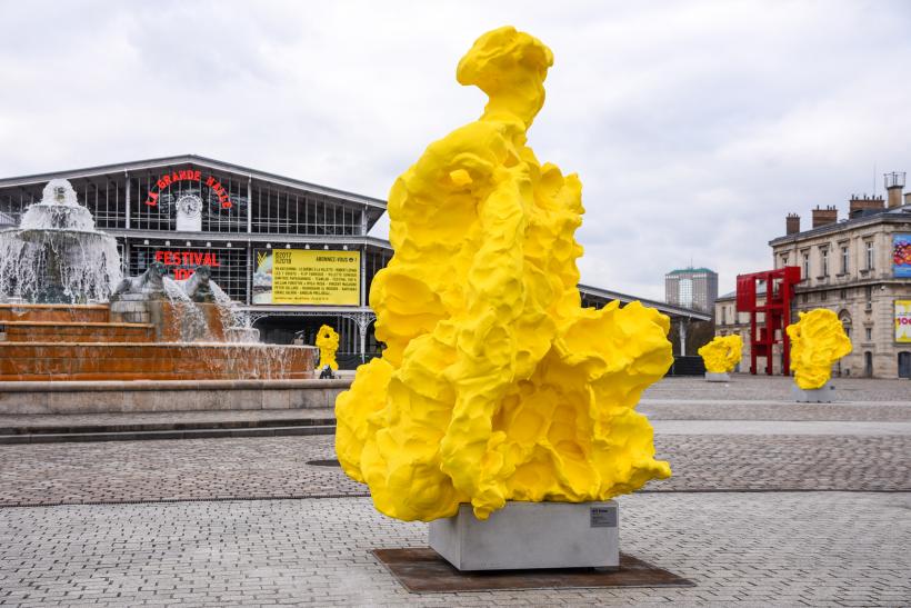 The plaza, like so many, has an ornament in the middle. In this case a large fountain with beautiful sculptural lions. The city and the people walk around it – it’s like theatre in the round. It has its own borders and colour palette which I thought was prime for what I do. I consider my work to be figurative even though it’s abstract and I feel like my works are moving. ‘Heads’ are not arranged in a perfect circle but they almost seem to dance around the fountain. The colour is bright and references city life, like a sign or road markings, and it creates some movement. The location of ‘Pac-Lab’, in front of the reflective Géode cinema, is like a stage right there.