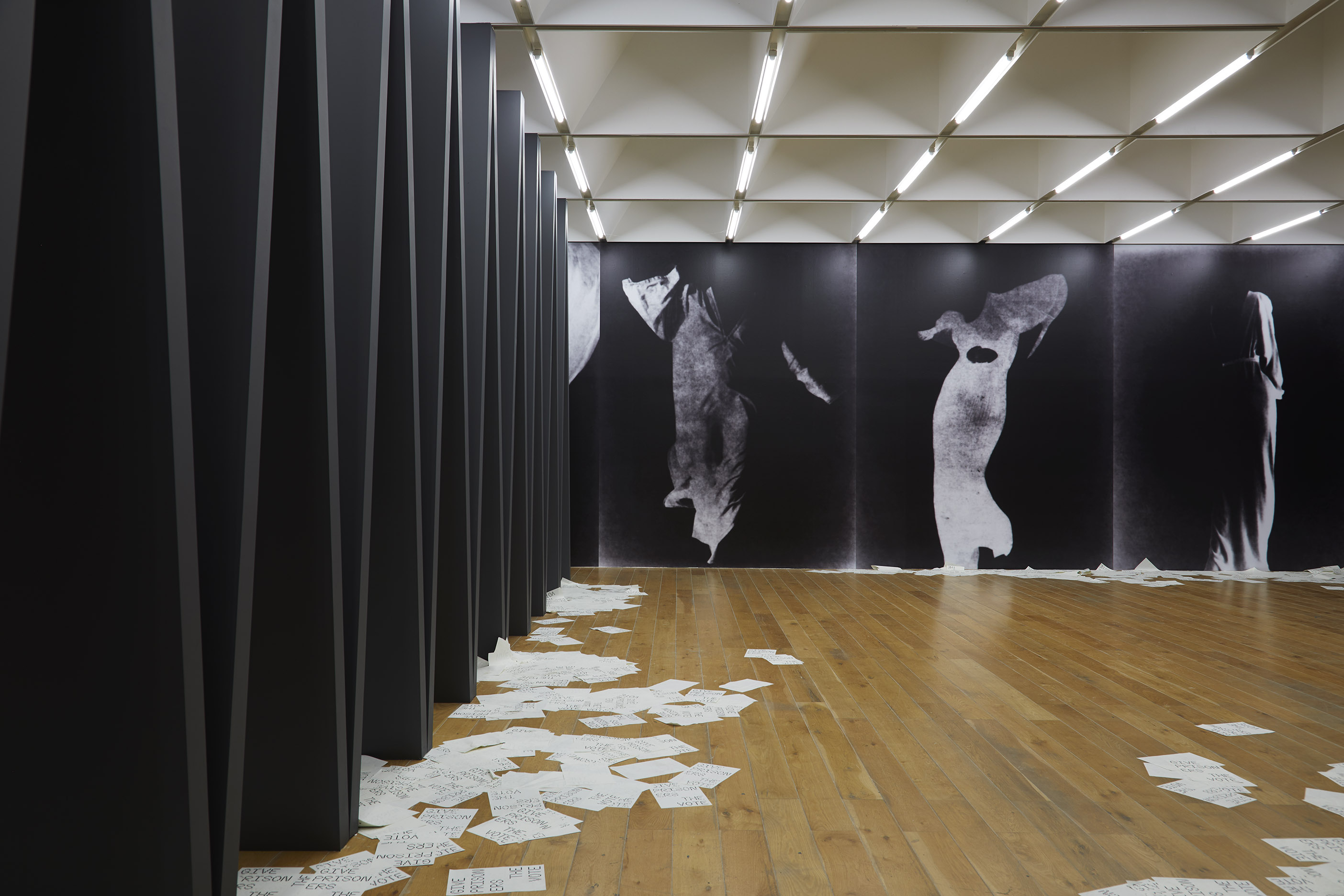 Encircling the sculpture are a series of monochrome pin hole photographs of women’s dresses. Blown up to fill the walls of Nottingham Contemporary, these black and white visions without bodies are by turns spectral and monumental; dancing, floating, looming. Accompanied by posters scattered on the floor printed with “Give prisoners the vote”, the photographs are tethered to the histories of suffrage and suffocating domesticity that many women remain all too familiar with.