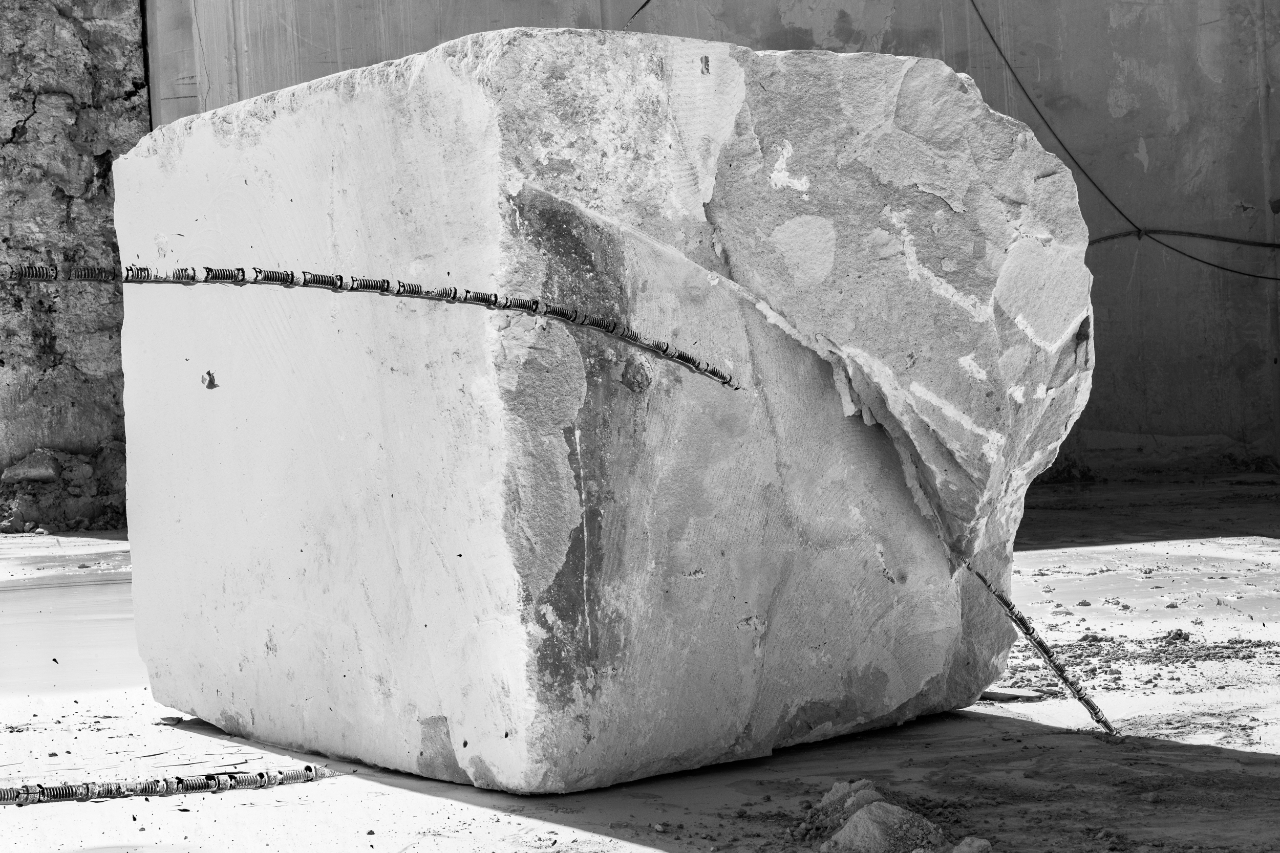 This region of Spain is distinguished by marble quarries cut into its hillsides and characterised by its baked earth, intense heat, and if these photographs are anything to go by, a sense of pandemic-resonant airlessness and isolation. Any trace of human activity within this series of work is understated, shown indirectly via the odd stray plastic bottle and instances of linear, shadowed cabling. Machine-cut rock faces and hewn blocks of marble offer alternative reminders of human intervention. Surface and texture tell tales. These images are saturated not only with issues surrounding ecology but also with the histories of architecture and sculpture production, lifting these into the viewer’s register as we move between separate but clearly interconnected works.