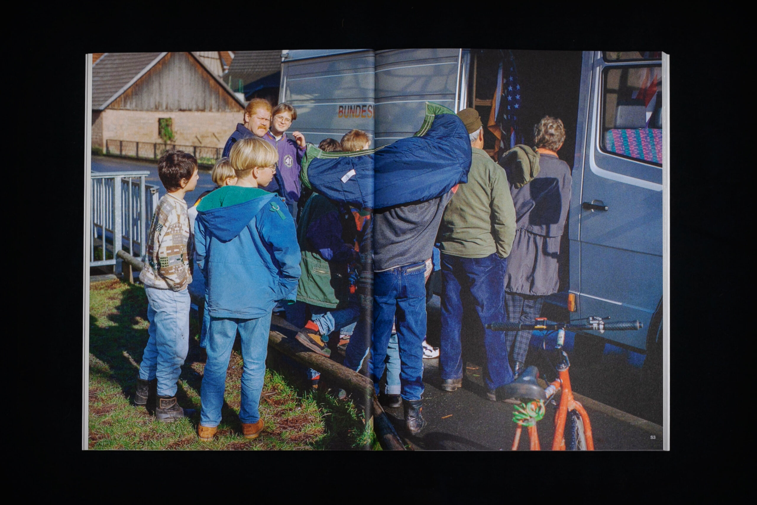The odd title E.M.T. in MSP pinpoints, albeit in coded form, the most significant parts of the project. E.M.T. are Eva, Mirjam and Thomas, three of Knes’ siblings, while MSP refers to Main-Spessart in Lower Franconia, Bavaria. The landscapes and interiors depicted bear almost as much weight as the portraits here; they are tethered to each other. In the photographs that unfold we find multiple narratives: from childhood play to adolescent experimentation and bare-chested self-expression; piles of sawn tree trunks ready for milling; swim meets, social gatherings, make-shift hideaways, overturned chairs, abandoned cars and domestic environments …