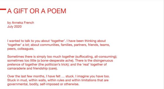 For this writing commission for Grain’s Covid-19 Responses project I have used the phrase ‘I am reaching out to you’ … More